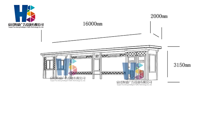 產(chǎn)品外觀 / PRODUCT DETAILS 產(chǎn)品信息 / PRODUCT INFO 【產(chǎn)品名稱】:新款候車亭HS54 【產(chǎn)品系列】:新款候車亭 【產(chǎn)品型號(hào)】:HS54 【產(chǎn)品規(guī)格】:長(zhǎng)16000mm 寬2000mm 高3150mm 【產(chǎn)品材質(zhì)】:熱鍍鋅鋼板 【使用年限】:10-15年 【詳情致電】:181-5189-0417、157-5170-8886 備注:產(chǎn)品可根據(jù)用戶需求選用材質(zhì)、顏色及配件,個(gè)性化定制。 1、表面采用靜電噴塑(氟碳烤漆/搪瓷處理) 2、頂棚采用100*100*1.5mm、100*150*2mm鍍鋅管,3mm鍍鋅板激光切割件、1.5mm鍍鋅板焊接骨架,鋪1mm鍍鋅板(10mm陽光板) 3、立柱采用150*150*3mm鍍鋅管 4、箱體采用1.5mm鍍鋅板折彎焊接成型,門框采用全玻鋁合金型材,視窗采用6mm鋼化玻璃 5、照明電器采用LED燈粒 產(chǎn)品尺寸 / PRODUCT SIZE 關(guān)于輝盛 / 為社會(huì)分擔(dān)責(zé)任,為客戶創(chuàng)造價(jià)值 宿遷輝盛廣告設(shè)備有限公司是一家集設(shè)計(jì)、研發(fā)、生產(chǎn)為一體的城市公共設(shè)施生產(chǎn)型企業(yè)。主要產(chǎn)品有:候車公交亭、公交站臺(tái)、閱報(bào)欄、路名牌、垃圾箱、燈箱等市政設(shè)施系列產(chǎn)品和工程配套設(shè)施系列產(chǎn)品,現(xiàn)有高級(jí)技師30多人,高級(jí)職稱設(shè)計(jì)人員10人,是一家具有自主開發(fā)和設(shè)計(jì)能力的以公交亭、智能公交為主導(dǎo)的綜合性城市公共設(shè)施制造企業(yè)。為了進(jìn)一步改善生產(chǎn)工藝,提高產(chǎn)品質(zhì)量,公司引進(jìn)了先進(jìn)生產(chǎn)設(shè)備,包括立臥式加工中心,工業(yè)涂裝流水線,CNC車床,線切割機(jī),大型數(shù)控板機(jī),數(shù)控折邊機(jī),數(shù)控沖孔機(jī)床,大型折彎?rùn)C(jī)等。公司還專門成立了產(chǎn)品研發(fā)部門,現(xiàn)每年自主開發(fā)或應(yīng)客戶要求設(shè)計(jì)推出多款新產(chǎn)品。 榮譽(yù)資質(zhì) / ENTERPRISE HONOR