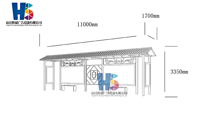 產品外觀 / PRODUCT DETAILS 產品信息 / PRODUCT INFO 【產品名稱】:新款候車亭HS29 【產品系列】:新款候車亭 【產品型號】:HS29 【產品規(guī)格】:長11000mm 寬1700mm 高3350mm 【產品材質】:熱鍍鋅鋼板 【使用年限】:10-15年 【詳情致電】:181-5189-0417、157-5170-8886 備注:產品可根據(jù)用戶需求選用材質、顏色及配件,個性化定制。 1、表面采用靜電噴塑(氟碳烤漆/搪瓷處理) 2、頂棚采用100*100*1.5mm、100*150*2mm鍍鋅管,3mm鍍鋅板激光切割件、1.5mm鍍鋅板焊接骨架,鋪1mm鍍鋅板(10mm陽光板) 3、立柱采用150*150*3mm鍍鋅管 4、箱體采用1.5mm鍍鋅板折彎焊接成型,門框采用全玻鋁合金型材,視窗采用6mm鋼化玻璃 5、照明電器采用LED燈粒 產品尺寸 / PRODUCT SIZE 關于輝盛 / 為社會分擔責任,為客戶創(chuàng)造價值 宿遷輝盛廣告設備有限公司是一家集設計、研發(fā)、生產為一體的城市公共設施生產型企業(yè)。主要產品有:候車公交亭、公交站臺、閱報欄、路名牌、垃圾箱、燈箱等市政設施系列產品和工程配套設施系列產品,現(xiàn)有高級技師30多人,高級職稱設計人員10人,是一家具有自主開發(fā)和設計能力的以公交亭、智能公交為主導的綜合性城市公共設施制造企業(yè)。為了進一步改善生產工藝,提高產品質量,公司引進了先進生產設備,包括立臥式加工中心,工業(yè)涂裝流水線,CNC車床,線切割機,大型數(shù)控板機,數(shù)控折邊機,數(shù)控沖孔機床,大型折彎機等。公司還專門成立了產品研發(fā)部門,現(xiàn)每年自主開發(fā)或應客戶要求設計推出多款新產品。 榮譽資質 / ENTERPRISE HONOR