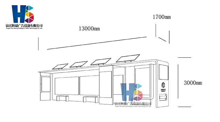 產(chǎn)品外觀 / PRODUCT DETAILS 產(chǎn)品信息 / PRODUCT INFO 【產(chǎn)品名稱】:新款候車亭HS23 【產(chǎn)品系列】:新款候車亭 【產(chǎn)品型號(hào)】:HS23 【產(chǎn)品規(guī)格】:長(zhǎng)13000mm 寬1700mm 高3000mm 【產(chǎn)品材質(zhì)】:熱鍍鋅鋼板 【使用年限】:10-15年 【詳情致電】:181-5189-0417、157-5170-8886 備注:產(chǎn)品可根據(jù)用戶需求選用材質(zhì)、顏色及配件,個(gè)性化定制。 1、表面采用靜電噴塑(氟碳烤漆/搪瓷處理) 2、頂棚采用100*100*1.5mm、100*150*2mm鍍鋅管,3mm鍍鋅板激光切割件、1.5mm鍍鋅板焊接骨架,鋪1mm鍍鋅板(10mm陽(yáng)光板) 3、立柱采用150*150*3mm鍍鋅管 4、箱體采用1.5mm鍍鋅板折彎焊接成型,門框采用全玻鋁合金型材,視窗采用6mm鋼化玻璃 5、照明電器采用LED燈粒 產(chǎn)品尺寸 / PRODUCT SIZE 關(guān)于輝盛 / 為社會(huì)分擔(dān)責(zé)任,為客戶創(chuàng)造價(jià)值 宿遷輝盛廣告設(shè)備有限公司是一家集設(shè)計(jì)、研發(fā)、生產(chǎn)為一體的城市公共設(shè)施生產(chǎn)型企業(yè)。主要產(chǎn)品有:候車公交亭、公交站臺(tái)、閱報(bào)欄、路名牌、垃圾箱、燈箱等市政設(shè)施系列產(chǎn)品和工程配套設(shè)施系列產(chǎn)品,現(xiàn)有高級(jí)技師30多人,高級(jí)職稱設(shè)計(jì)人員10人,是一家具有自主開發(fā)和設(shè)計(jì)能力的以公交亭、智能公交為主導(dǎo)的綜合性城市公共設(shè)施制造企業(yè)。為了進(jìn)一步改善生產(chǎn)工藝,提高產(chǎn)品質(zhì)量,公司引進(jìn)了先進(jìn)生產(chǎn)設(shè)備,包括立臥式加工中心,工業(yè)涂裝流水線,CNC車床,線切割機(jī),大型數(shù)控板機(jī),數(shù)控折邊機(jī),數(shù)控沖孔機(jī)床,大型折彎?rùn)C(jī)等。公司還專門成立了產(chǎn)品研發(fā)部門,現(xiàn)每年自主開發(fā)或應(yīng)客戶要求設(shè)計(jì)推出多款新產(chǎn)品。 榮譽(yù)資質(zhì) / ENTERPRISE HONOR