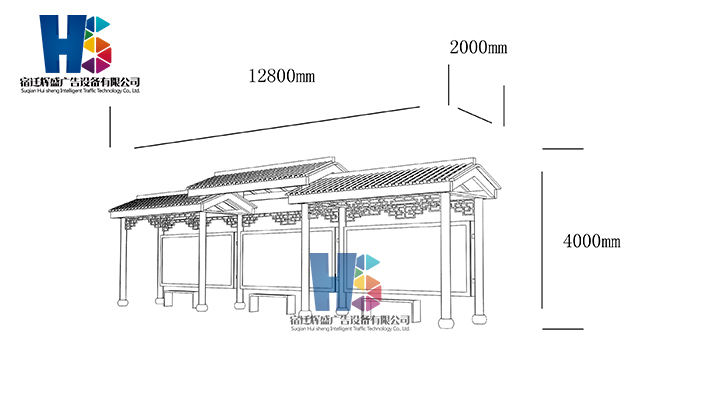 產(chǎn)品外觀 / PRODUCT DETAILS 產(chǎn)品信息 / PRODUCT INFO 【產(chǎn)品名稱】:新款候車亭HS14 【產(chǎn)品系列】:新款候車亭 【產(chǎn)品型號(hào)】:HS14 【產(chǎn)品規(guī)格】:長(zhǎng)12800mm 寬2000mm 高4000mm 【產(chǎn)品材質(zhì)】:熱鍍鋅鋼板 【使用年限】:10-15年 【詳情致電】:181-5189-0417、157-5170-8886 備注:產(chǎn)品可根據(jù)用戶需求選用材質(zhì)、顏色及配件,個(gè)性化定制。 1、表面采用靜電噴塑(氟碳烤漆/搪瓷處理) 2、頂棚采用100*100*1.5mm、100*150*2mm鍍鋅管,3mm鍍鋅板激光切割件、1.5mm鍍鋅板焊接骨架,鋪1mm鍍鋅板(10mm陽(yáng)光板) 3、立柱采用150*150*3mm鍍鋅管 4、箱體采用1.5mm鍍鋅板折彎焊接成型,門框采用全玻鋁合金型材,視窗采用6mm鋼化玻璃 5、照明電器采用LED燈粒 產(chǎn)品尺寸 / PRODUCT SIZE 關(guān)于輝盛 / 為社會(huì)分擔(dān)責(zé)任,為客戶創(chuàng)造價(jià)值 宿遷輝盛廣告設(shè)備有限公司是一家集設(shè)計(jì)、研發(fā)、生產(chǎn)為一體的城市公共設(shè)施生產(chǎn)型企業(yè)。主要產(chǎn)品有:候車公交亭、公交站臺(tái)、閱報(bào)欄、路名牌、垃圾箱、燈箱等市政設(shè)施系列產(chǎn)品和工程配套設(shè)施系列產(chǎn)品,現(xiàn)有高級(jí)技師30多人,高級(jí)職稱設(shè)計(jì)人員10人,是一家具有自主開發(fā)和設(shè)計(jì)能力的以公交亭、智能公交為主導(dǎo)的綜合性城市公共設(shè)施制造企業(yè)。為了進(jìn)一步改善生產(chǎn)工藝,提高產(chǎn)品質(zhì)量,公司引進(jìn)了先進(jìn)生產(chǎn)設(shè)備,包括立臥式加工中心,工業(yè)涂裝流水線,CNC車床,線切割機(jī),大型數(shù)控板機(jī),數(shù)控折邊機(jī),數(shù)控沖孔機(jī)床,大型折彎?rùn)C(jī)等。公司還專門成立了產(chǎn)品研發(fā)部門,現(xiàn)每年自主開發(fā)或應(yīng)客戶要求設(shè)計(jì)推出多款新產(chǎn)品。 榮譽(yù)資質(zhì) / ENTERPRISE HONOR
