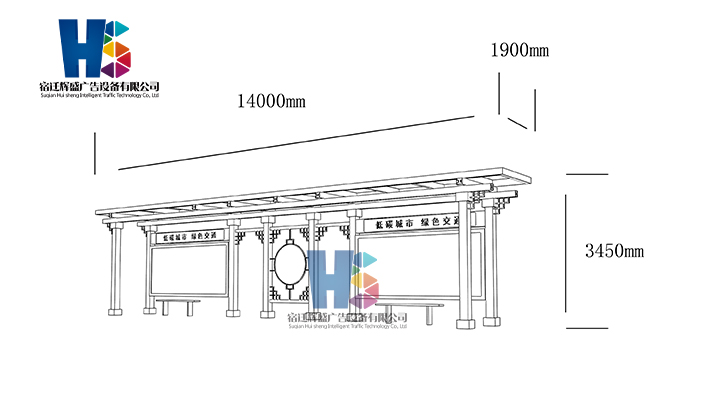 產(chǎn)品外觀 / PRODUCT DETAILS 產(chǎn)品信息 / PRODUCT INFO 【產(chǎn)品名稱】:新款候車亭HS9 【產(chǎn)品系列】:新款候車亭 【產(chǎn)品型號(hào)】:HS9 【產(chǎn)品規(guī)格】:長(zhǎng)14000mm 寬1900mm 高3450mm 【產(chǎn)品材質(zhì)】:熱鍍鋅鋼板 【使用年限】:10-15年 【詳情致電】:181-5189-0417、157-5170-8886 備注:產(chǎn)品可根據(jù)用戶需求選用材質(zhì)、顏色及配件,個(gè)性化定制。 1、表面采用靜電噴塑(氟碳烤漆/搪瓷處理) 2、頂棚采用100*100*1.5mm、100*150*2mm鍍鋅管,3mm鍍鋅板激光切割件、1.5mm鍍鋅板焊接骨架,鋪1mm鍍鋅板(10mm陽光板) 3、立柱采用150*150*3mm鍍鋅管 4、箱體采用1.5mm鍍鋅板折彎焊接成型,門框采用全玻鋁合金型材,視窗采用6mm鋼化玻璃 5、照明電器采用LED燈粒 產(chǎn)品尺寸 / PRODUCT SIZE 關(guān)于輝盛 / 為社會(huì)分擔(dān)責(zé)任,為客戶創(chuàng)造價(jià)值 宿遷輝盛廣告設(shè)備有限公司是一家集設(shè)計(jì)、研發(fā)、生產(chǎn)為一體的城市公共設(shè)施生產(chǎn)型企業(yè)。主要產(chǎn)品有:候車公交亭、公交站臺(tái)、閱報(bào)欄、路名牌、垃圾箱、燈箱等市政設(shè)施系列產(chǎn)品和工程配套設(shè)施系列產(chǎn)品,現(xiàn)有高級(jí)技師30多人,高級(jí)職稱設(shè)計(jì)人員10人,是一家具有自主開發(fā)和設(shè)計(jì)能力的以公交亭、智能公交為主導(dǎo)的綜合性城市公共設(shè)施制造企業(yè)。為了進(jìn)一步改善生產(chǎn)工藝,提高產(chǎn)品質(zhì)量,公司引進(jìn)了先進(jìn)生產(chǎn)設(shè)備,包括立臥式加工中心,工業(yè)涂裝流水線,CNC車床,線切割機(jī),大型數(shù)控板機(jī),數(shù)控折邊機(jī),數(shù)控沖孔機(jī)床,大型折彎?rùn)C(jī)等。公司還專門成立了產(chǎn)品研發(fā)部門,現(xiàn)每年自主開發(fā)或應(yīng)客戶要求設(shè)計(jì)推出多款新產(chǎn)品。 榮譽(yù)資質(zhì) / ENTERPRISE HONOR