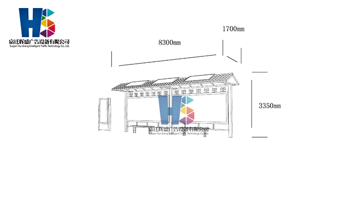 產(chǎn)品外觀 / PRODUCT DETAILS 產(chǎn)品信息 / PRODUCT INFO 【產(chǎn)品名稱】:新款候車亭HS5 【產(chǎn)品系列】:新款候車亭 【產(chǎn)品型號】:HS5 【產(chǎn)品規(guī)格】:長8300mm 寬1700mm 高3350mm 【產(chǎn)品材質(zhì)】:熱鍍鋅鋼板 【使用年限】:10-15年 【詳情致電】:181-5189-0417、157-5170-8886 備注:產(chǎn)品可根據(jù)用戶需求選用材質(zhì)、顏色及配件,個性化定制。 1、表面采用靜電噴塑(氟碳烤漆/搪瓷處理) 2、頂棚采用100*100*1.5mm、100*150*2mm鍍鋅管,3mm鍍鋅板激光切割件、1.5mm鍍鋅板焊接骨架,鋪1mm鍍鋅板(10mm陽光板) 3、立柱采用150*150*3mm鍍鋅管 4、箱體采用1.5mm鍍鋅板折彎焊接成型,門框采用全玻鋁合金型材,視窗采用6mm鋼化玻璃 5、照明電器采用LED燈粒 產(chǎn)品尺寸 / PRODUCT SIZE 關(guān)于輝盛 / 為社會分擔(dān)責(zé)任,為客戶創(chuàng)造價值 宿遷輝盛廣告設(shè)備有限公司是一家集設(shè)計、研發(fā)、生產(chǎn)為一體的城市公共設(shè)施生產(chǎn)型企業(yè)。主要產(chǎn)品有:候車公交亭、公交站臺、閱報欄、路名牌、垃圾箱、燈箱等市政設(shè)施系列產(chǎn)品和工程配套設(shè)施系列產(chǎn)品,現(xiàn)有高級技師30多人,高級職稱設(shè)計人員10人,是一家具有自主開發(fā)和設(shè)計能力的以公交亭、智能公交為主導(dǎo)的綜合性城市公共設(shè)施制造企業(yè)。為了進(jìn)一步改善生產(chǎn)工藝,提高產(chǎn)品質(zhì)量,公司引進(jìn)了先進(jìn)生產(chǎn)設(shè)備,包括立臥式加工中心,工業(yè)涂裝流水線,CNC車床,線切割機,大型數(shù)控板機,數(shù)控折邊機,數(shù)控沖孔機床,大型折彎機等。公司還專門成立了產(chǎn)品研發(fā)部門,現(xiàn)每年自主開發(fā)或應(yīng)客戶要求設(shè)計推出多款新產(chǎn)品。 榮譽資質(zhì) / ENTERPRISE HONOR