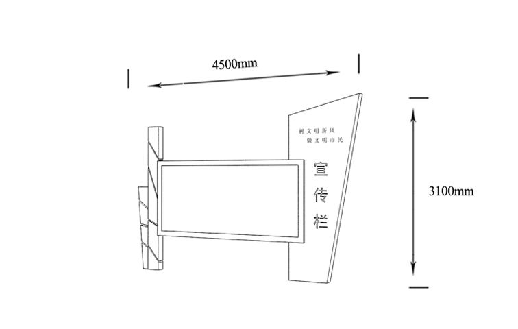 產(chǎn)品外觀 / PRODUCT DETAILS 產(chǎn)品信息 / PRODUCT INFO 【產(chǎn)品名稱】:宣傳欄XCL5-1 【產(chǎn)品系列】:宣傳欄 【產(chǎn)品型號(hào)】:XCL5-1 【產(chǎn)品規(guī)格】:長(zhǎng)4500mm高3100mm 【產(chǎn)品材質(zhì)】:熱鍍鋅鋼板 【使用年限】:10-15年 【詳情致電】:181-5189-0417、157-5170-8886 備注:產(chǎn)品可根據(jù)用戶需求選用材質(zhì)、顏色及配件,個(gè)性化定制。 1、表面采用靜電噴塑(氟碳烤漆/搪瓷處理) 2、頂棚采用100*100*1.5mm、100*150*2mm鍍鋅管,3mm鍍鋅板激光切割件、1.5mm鍍鋅板焊接骨架,鋪1mm鍍鋅板(10mm陽(yáng)光板) 3、立柱采用150*150*3mm鍍鋅管 4、箱體采用1.5mm鍍鋅板折彎焊接成型,門框采用全玻鋁合金型材,視窗采用6mm鋼化玻璃 5、照明電器采用LED燈粒 產(chǎn)品尺寸 / PRODUCT SIZE 關(guān)于輝盛 / 為社會(huì)分擔(dān)責(zé)任,為客戶創(chuàng)造價(jià)值 宿遷輝盛廣告設(shè)備有限公司是一家集設(shè)計(jì)、研發(fā)、生產(chǎn)為一體的城市公共設(shè)施生產(chǎn)型企業(yè)。主要產(chǎn)品有:候車公交亭、公交站臺(tái)、閱報(bào)欄、路名牌、垃圾箱、燈箱等市政設(shè)施系列產(chǎn)品和工程配套設(shè)施系列產(chǎn)品,現(xiàn)有高級(jí)技師30多人,高級(jí)職稱設(shè)計(jì)人員10人,是一家具有自主開發(fā)和設(shè)計(jì)能力的以公交亭、智能公交為主導(dǎo)的綜合性城市公共設(shè)施制造企業(yè)。為了進(jìn)一步改善生產(chǎn)工藝,提高產(chǎn)品質(zhì)量,公司引進(jìn)了先進(jìn)生產(chǎn)設(shè)備,包括立臥式加工中心,工業(yè)涂裝流水線,CNC車床,線切割機(jī),大型數(shù)控板機(jī),數(shù)控折邊機(jī),數(shù)控沖孔機(jī)床,大型折彎?rùn)C(jī)等。公司還專門成立了產(chǎn)品研發(fā)部門,現(xiàn)每年自主開發(fā)或應(yīng)客戶要求設(shè)計(jì)推出多款新產(chǎn)品。 榮譽(yù)資質(zhì) / ENTERPRISE HONOR
