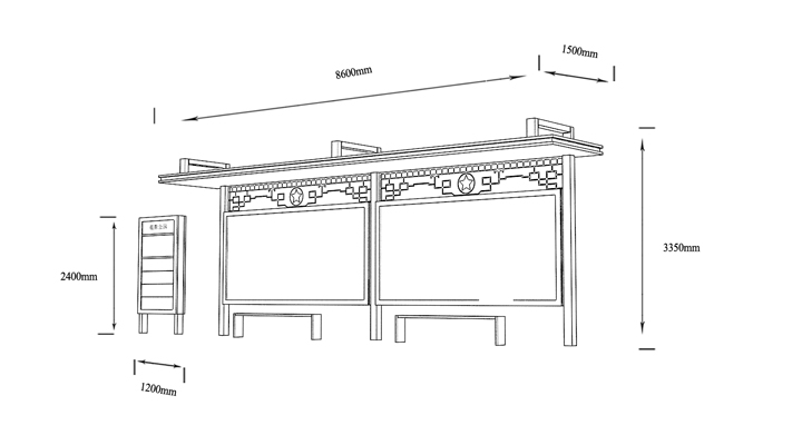 產(chǎn)品外觀 / PRODUCT DETAILS 產(chǎn)品信息 / PRODUCT INFO 【產(chǎn)品名稱】:中式古典候車亭GD6 【產(chǎn)品系列】:中式古典候車亭 【產(chǎn)品型號】:GD6 【產(chǎn)品規(guī)格】:長10800mm 寬1700mm 高2900mm 【產(chǎn)品材質(zhì)】:熱鍍鋅鋼板 【使用年限】:10-15年 【詳情致電】:181-5189-0417、157-5170-8886 備注:產(chǎn)品可根據(jù)用戶需求選用材質(zhì)、顏色及配件,個性化定制。 1、表面采用靜電噴塑(氟碳烤漆/搪瓷處理) 2、頂棚采用100*100*1.5mm、100*150*2mm鍍鋅管,3mm鍍鋅板激光切割件、1.5mm鍍鋅板焊接骨架,鋪1mm鍍鋅板(10mm陽光板) 3、立柱采用150*150*3mm鍍鋅管 4、箱體采用1.5mm鍍鋅板折彎焊接成型,門框采用全玻鋁合金型材,視窗采用6mm鋼化玻璃 5、照明電器采用LED燈粒 產(chǎn)品尺寸 / PRODUCT SIZE 關(guān)于輝盛 / 為社會分擔(dān)責(zé)任,為客戶創(chuàng)造價值 宿遷輝盛廣告設(shè)備有限公司是一家集設(shè)計、研發(fā)、生產(chǎn)為一體的城市公共設(shè)施生產(chǎn)型企業(yè)。主要產(chǎn)品有:候車公交亭、公交站臺、閱報欄、路名牌、垃圾箱、燈箱等市政設(shè)施系列產(chǎn)品和工程配套設(shè)施系列產(chǎn)品,現(xiàn)有高級技師30多人,高級職稱設(shè)計人員10人,是一家具有自主開發(fā)和設(shè)計能力的以公交亭、智能公交為主導(dǎo)的綜合性城市公共設(shè)施制造企業(yè)。為了進一步改善生產(chǎn)工藝,提高產(chǎn)品質(zhì)量,公司引進了先進生產(chǎn)設(shè)備,包括立臥式加工中心,工業(yè)涂裝流水線,CNC車床,線切割機,大型數(shù)控板機,數(shù)控折邊機,數(shù)控沖孔機床,大型折彎機等。公司還專門成立了產(chǎn)品研發(fā)部門,現(xiàn)每年自主開發(fā)或應(yīng)客戶要求設(shè)計推出多款新產(chǎn)品。 榮譽資質(zhì) / ENTERPRISE HONOR