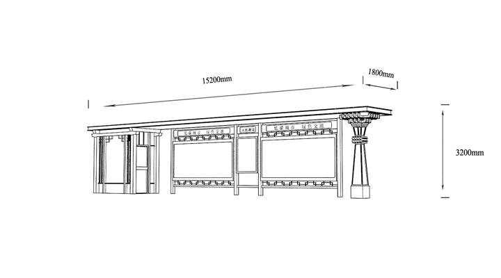 產(chǎn)品外觀 / PRODUCT DETAILS 產(chǎn)品信息 / PRODUCT INFO 【產(chǎn)品名稱】:中式古典候車亭GD1 【產(chǎn)品系列】:中式古典候車亭 【產(chǎn)品型號】:GD1 【產(chǎn)品規(guī)格】:長10800mm 寬1700mm 高2900mm 【產(chǎn)品材質(zhì)】:熱鍍鋅鋼板 【使用年限】:10-15年 【詳情致電】:181-5189-0417、157-5170-8886 備注:產(chǎn)品可根據(jù)用戶需求選用材質(zhì)、顏色及配件,個性化定制。 1、表面采用靜電噴塑(氟碳烤漆/搪瓷處理) 2、頂棚采用100*100*1.5mm、100*150*2mm鍍鋅管,3mm鍍鋅板激光切割件、1.5mm鍍鋅板焊接骨架,鋪1mm鍍鋅板(10mm陽光板) 3、立柱采用150*150*3mm鍍鋅管 4、箱體采用1.5mm鍍鋅板折彎焊接成型,門框采用全玻鋁合金型材,視窗采用6mm鋼化玻璃 5、照明電器采用LED燈粒 產(chǎn)品尺寸 / PRODUCT SIZE 關于輝盛 / 為社會分擔責任,為客戶創(chuàng)造價值 宿遷輝盛廣告設備有限公司是一家集設計、研發(fā)、生產(chǎn)為一體的城市公共設施生產(chǎn)型企業(yè)。主要產(chǎn)品有:候車公交亭、公交站臺、閱報欄、路名牌、垃圾箱、燈箱等市政設施系列產(chǎn)品和工程配套設施系列產(chǎn)品,現(xiàn)有高級技師30多人,高級職稱設計人員10人,是一家具有自主開發(fā)和設計能力的以公交亭、智能公交為主導的綜合性城市公共設施制造企業(yè)。為了進一步改善生產(chǎn)工藝,提高產(chǎn)品質(zhì)量,公司引進了先進生產(chǎn)設備,包括立臥式加工中心,工業(yè)涂裝流水線,CNC車床,線切割機,大型數(shù)控板機,數(shù)控折邊機,數(shù)控沖孔機床,大型折彎機等。公司還專門成立了產(chǎn)品研發(fā)部門,現(xiàn)每年自主開發(fā)或應客戶要求設計推出多款新產(chǎn)品。 榮譽資質(zhì) / ENTERPRISE HONOR
